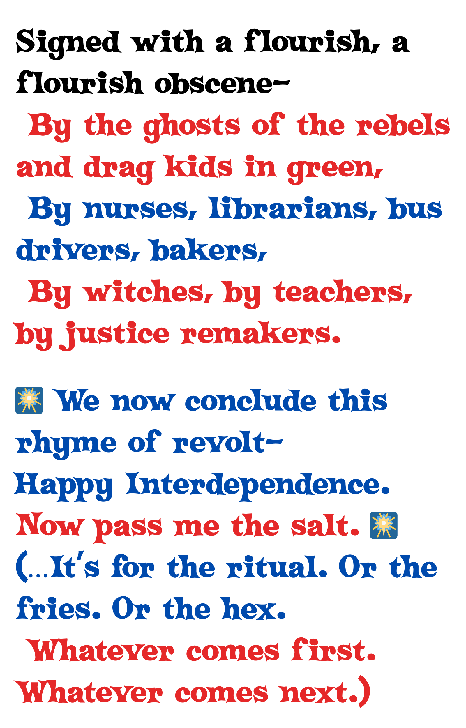 (Seuss-style remix for July 4th in the year of our Ongoing Discontent) In the Year of the Oh-No, two-thousand-and-five, We declare we’re still here, we declare we’re alive. But the sky is on fire and the truth’s under siege, So we rhyme through the wreckage and whisper, “We leave.”